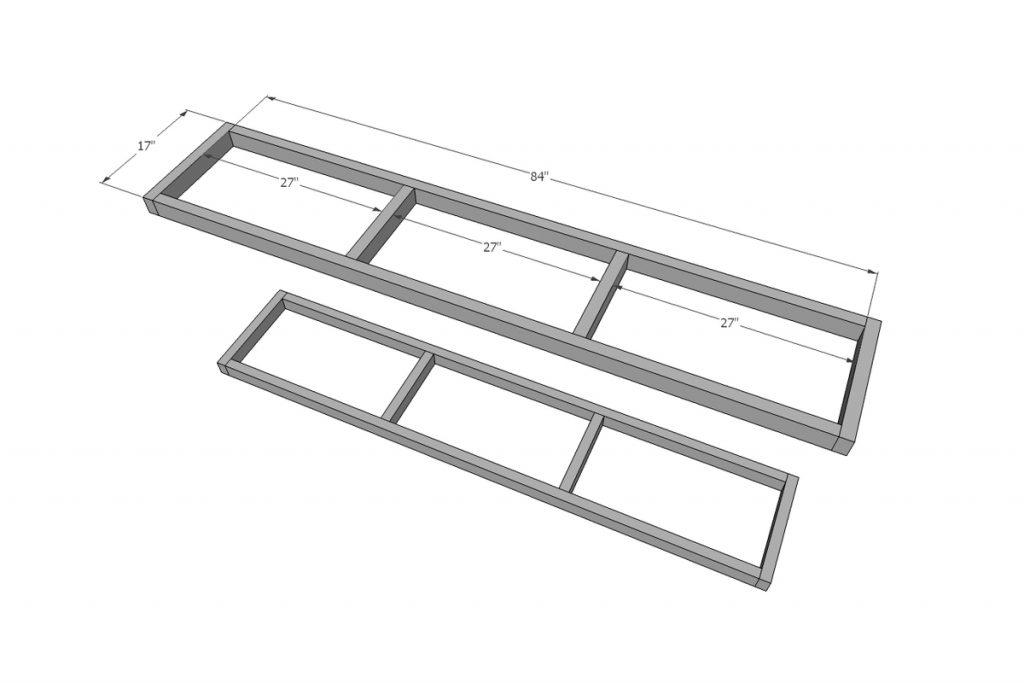 2×3 ebatlı tahtalardan iki çerçeve oluşturun. Tüm planın ana desteği bu olduğundan çerçeveler birbirine vidalanmalıdır. 6,4 cm uzunluğunda vida veya daha uzun vidalar kullanın. Kreg Jig kullanıyorsanız vidalarınızın uzunluğu 3,8 cm ve 6,35 cm olmalıdır. Ek yerlerini yapıştırmayı unutmayın. Burada mükemmel olma konusunda endişelenmeyin, çerçeve iş bitince gözükmeyecek.