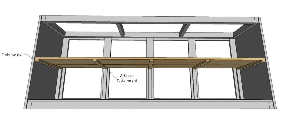 Alt rafları çerçeveye yerleştirin. 3,2 cm’den daha uzun çivilerle çivi çakın ve yapıştırın. Levhalar arasında bir boşluk olabilir. (kenarlar 0,6 cm geri).