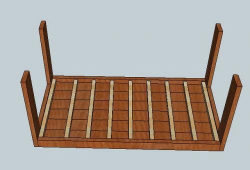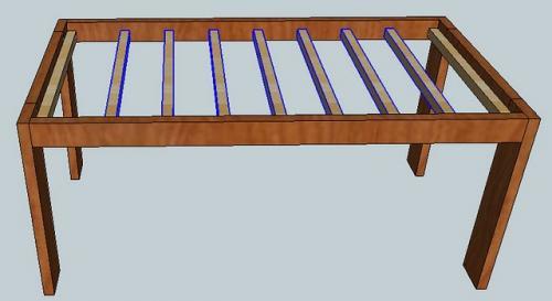 Masayı ters çevirin ve tüm 2×2 destek parçalarını her masa üstü tahtası için iki şer delik açın ve vidalayın. Toplam 108 delik açacaksınız. Önceden delinmiş deliklerden üst kısmı 2×2 destek parçalarına vidalayın.