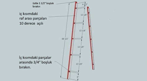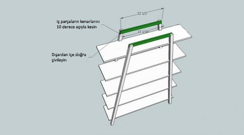 - 16 tane 1×2 ebatında 13 1/8 ″ uzunluğunda tahta (Raflar Arası destek – her iki uç birbirine 10 derece paralel)
