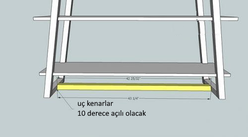 - 1 tane 2×2 ebatında 43 1/4″ alt orta destek parçası