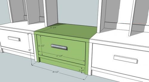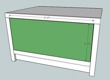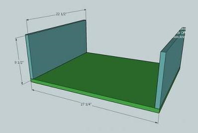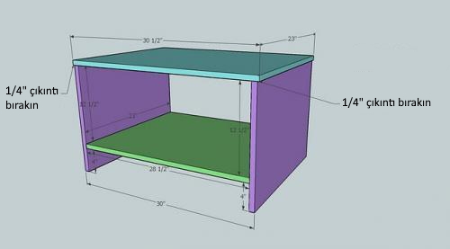 - I) 1 tane 3/4 kalınlığında 27 1/4″ x 22 1/2″ boyutunda kesilmiş kontrplak (Çekmece Altı)