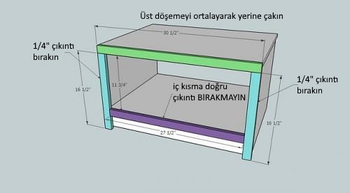 2″ çivi ve yapıştırıcı kullanarak A tahtalarını (yukarıda mor ile gösterilmiştir) B’nin uç kenarlarına (yukarıda yeşil olarak gösterilmiştir) çakın. Size rehberlik etmesi için yukarıdaki şemadaki ölçümleri kullanın. Daha sonra 2″ çivi ve tutkal kullanarak üst kısmı C (yukarıda mavi ile gösterilmiştir) yanlara çakın. C parçasını takarken yanlarda 1/4″ çıkıntı bırakın.
